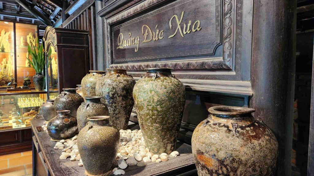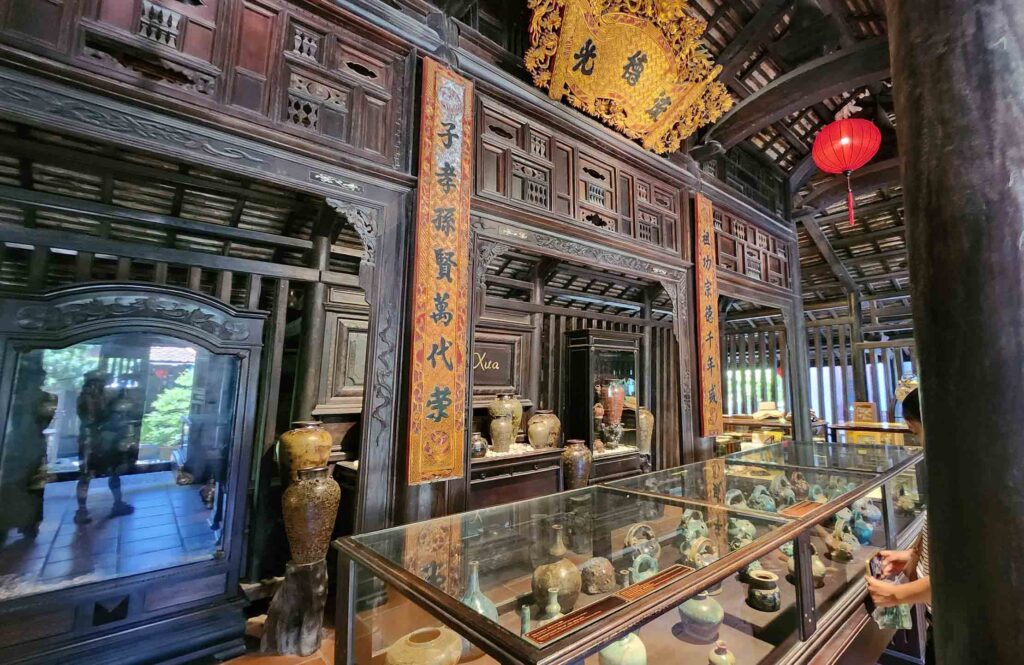 Ngôi nhà gỗ thứ nhất được bài trí với khung dệt cổ của người làng nghề lụa Ngân Sơn cùng những vật dụng đánh bắt cá ven sông. Ngôi nhà cổ thứ hai được bài trí với những cổ vật của làng gốm Quảng Đức, một số đồ cổ bằng đồng thau. Đó là những chậu kiểng trồng hoa, hồ cá kiểng… cho dòng gốm không tráng men.